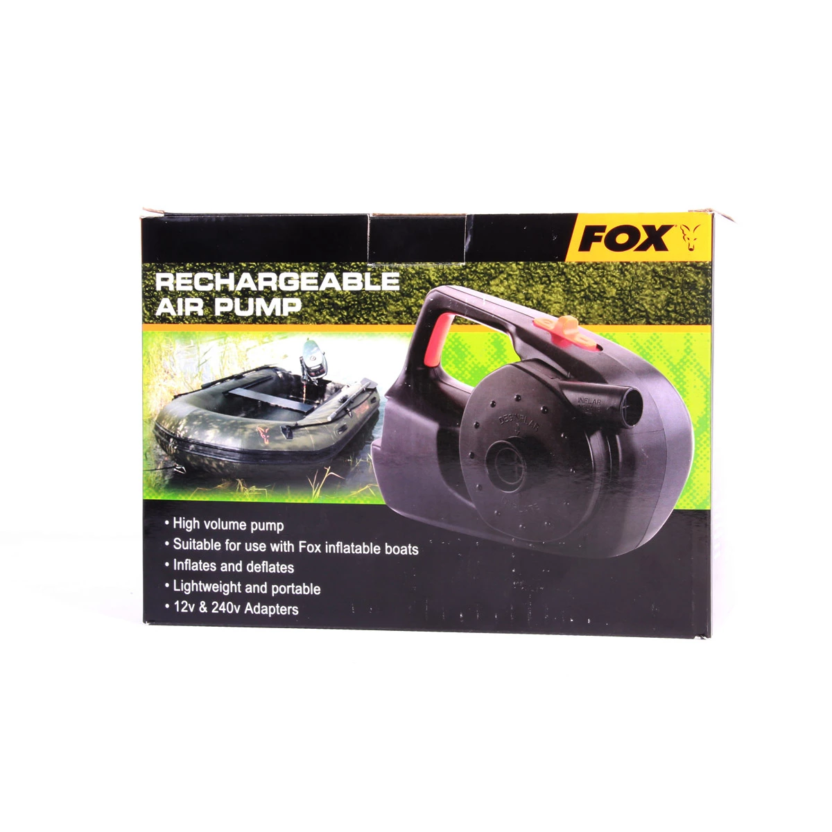 De Fox Fox Rechargeable Air Pump is een elektrische pomp waarmee je zonder moeite de grootste rubberboten opblaast. Deze pomp heeft een groot vermogen waardoor je zelfs grote rubberboten snel vult met lucht. De pomp wordt standaard geleverd met een slang en een mondstuk. Dit mondstuk past sowieso op de rubberboten van Fox, maar ook op vele andere merken rubberboten.