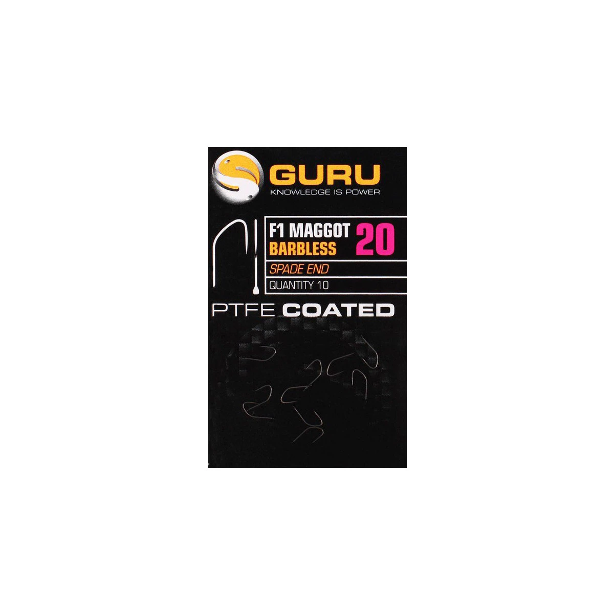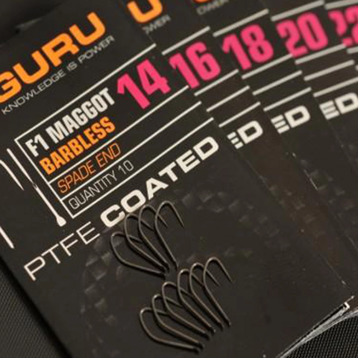 Deze Guru F1 maggot haak is speciaal ontwikkeld voor op verenigingswateren en de commerciele visserij. De Guru F1 Maggot hook heeft een PTFE Coating. Dit zorgt ervoor dat de haak niet reflecteerd en glad wordt. Waardoor de penetratie in de bek beter wordt. De Maggot F1 haak heeft een unieke vorm is redelijk dun van draad en langstelig met een hoekige bocht, wat ervoor zorgt dat haak aas perfect in deze bocht blijft zitten en de haak punt niet belemmert.