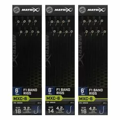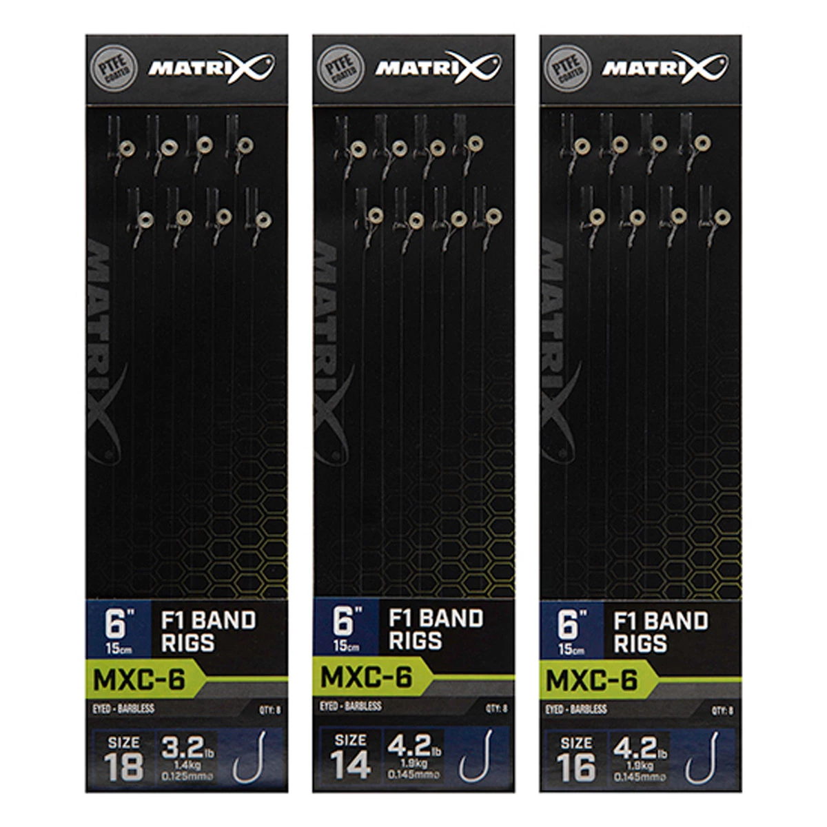 Deze MXC-6 F1 Bands zijn onderlijnen speciaal gemaakt voor het vissen met de vaste hengel op F1’s of kleine karpers. De onderlijnen zijn gemaakt van ultrascherpe MXC-6 PTFE gecoate haken en Power Micron mono en nauwkeurig geknoopt op een lengte van 10cm (4 inches) voor perfecte opslag in Matrix onderlijn cases.