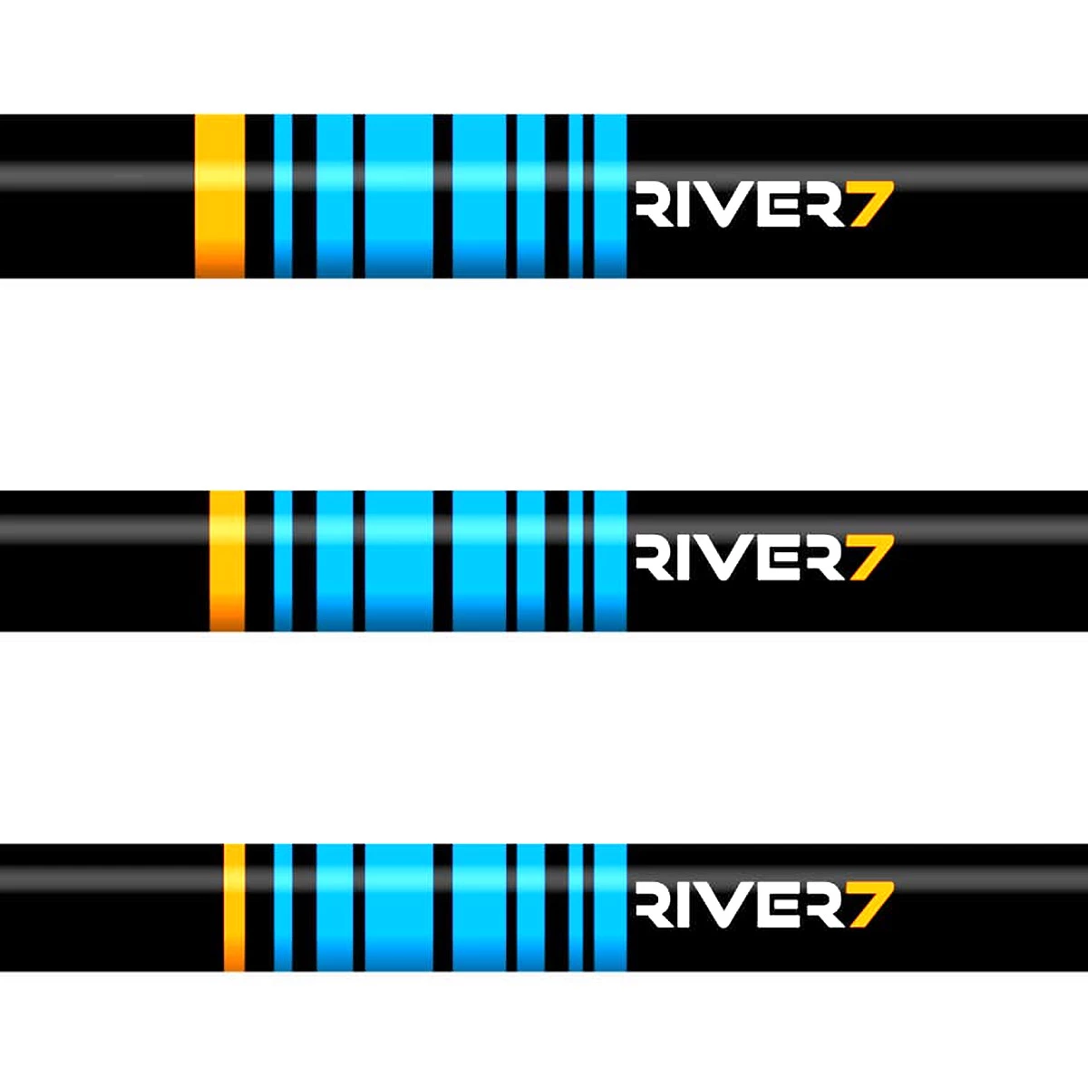 River7 hengels zijn met de hand afgebouwd door vakmensen die ons merk een warm hart toedragen, ons begrijpen, maar ook meedenken op bijvoorbeeld het gebied van kwaliteit. Alle hengels hebben 7 blauwe bandjes. Deze staan voor de 7 rivieren waar River7 is ontstaan: Merwede, Amer, Oude Maas, Hollandsdiep, Haringvliet, Spui en Dordtse Kil. Het DNA van ons merk. Voor deze blauwe bandjes (R7 logo) zie je een andere kleur; Oranje, Geel of groen. Deze kleurcode is er in drie varianten; Dik, Middel en een Dun bandje. De kleur staat o.a. voor de techniek en actie/werpgewicht.
